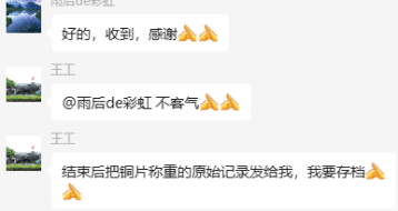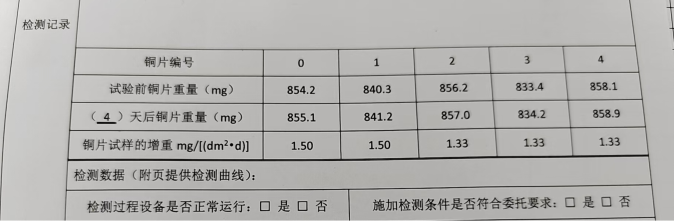 為了更好地說(shuō)明銅片試驗(yàn)的重要性,下面分享一個(gè)檢測(cè)公司的銅片試驗(yàn)實(shí)際案例:2024年8月份合肥******檢測(cè)技術(shù)有限公司第一次采購(gòu)我司一臺(tái)型號(hào)為“WHQ-300B”型的混合氣體腐蝕試驗(yàn)箱,設(shè)備被運(yùn)送到客戶指定的場(chǎng)地安裝調(diào)試運(yùn)行。安裝調(diào)試后,客戶后期自行進(jìn)行一次銅片增重試驗(yàn),我司技術(shù)人員進(jìn)行線上指導(dǎo)操作,試驗(yàn)結(jié)束之后客戶將數(shù)據(jù)發(fā)給我司,以下是客戶和我司聊天記錄以及客戶做的數(shù)據(jù)信息: